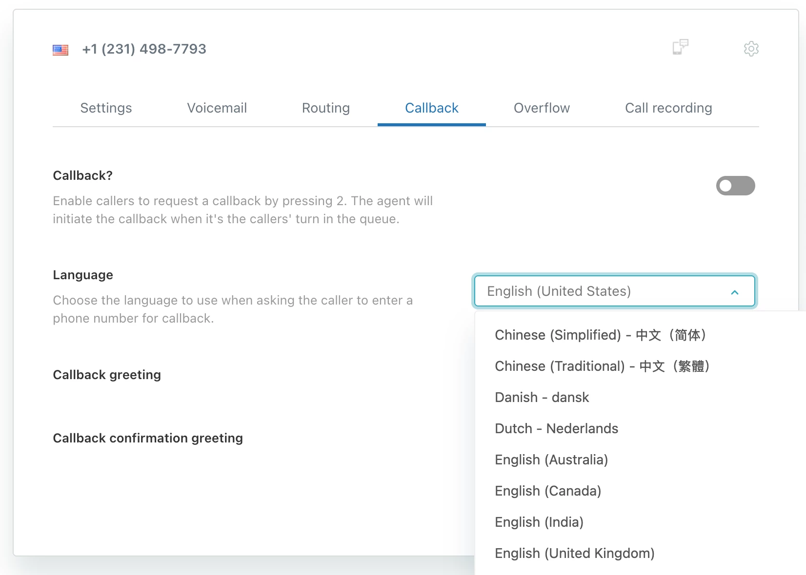 This issue was identified during our internal testing phase while evaluating whether to enable the callback feature for live customers. After a caller presses ‘2’ to request a callback, the system automatically plays the following uneditable English-only prompt:
