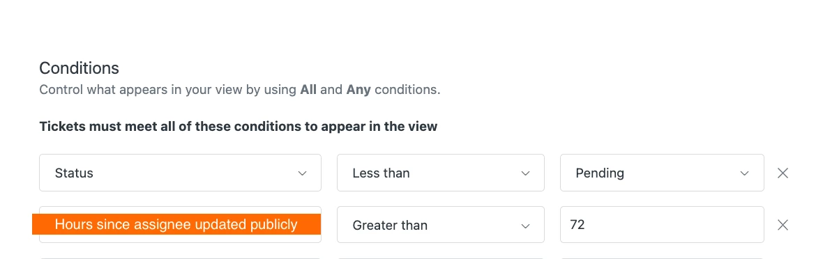 We are in need of view for agents. We believe this would be helpful for many support teams. We need a view for tickets that are less than pending status, that have had no public reply/comment in 72 hours or greater.