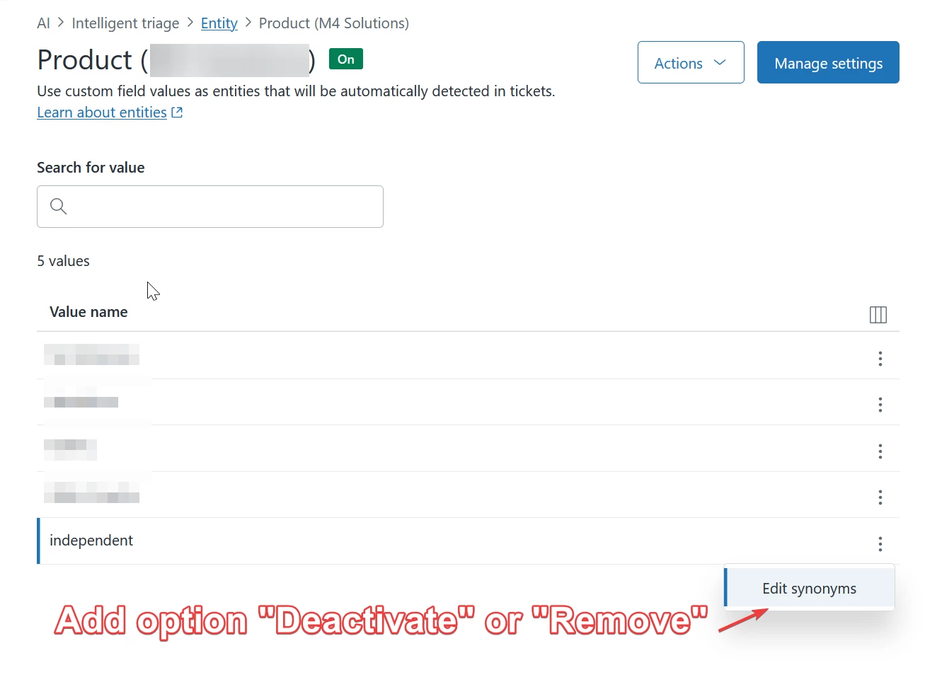 To use the Entity functionality of the Zendesk CoPilot add-on effectively and generate measurable business value, we require the ability to deactivate/remove individual entity values that are automatically derived from Custom Fields (Drop-down or Multi-select types).