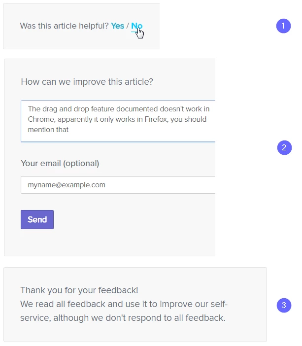 To this end we'd like to collect feedback from users when they read a Help Center article, but didn't find it helpful or what they were looking for (or they spot a mistake, etc), why they didn't find it helpful.