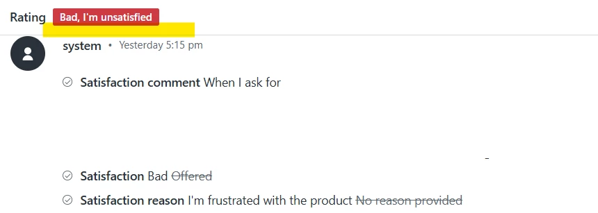1) In a ticket, you can no longer see the customer comment under the rating at the top of a ticket like you could with legacy. It is frustrating to have to open events just to see the comments in the new version. (it should also show the reason for a bad CSAT under rating)