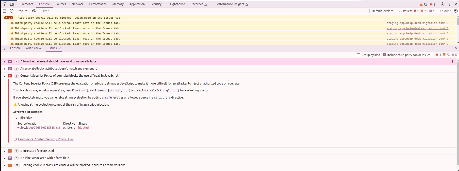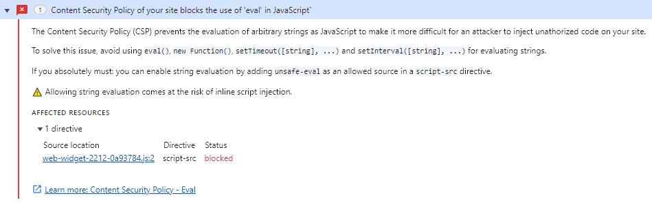 Refused to evaluate a string as JavaScript because 'unsafe-eval' is not an allowed source of script in the following Content Security Policy directive: "script-src *.zdassets.com *.zendesk.com"